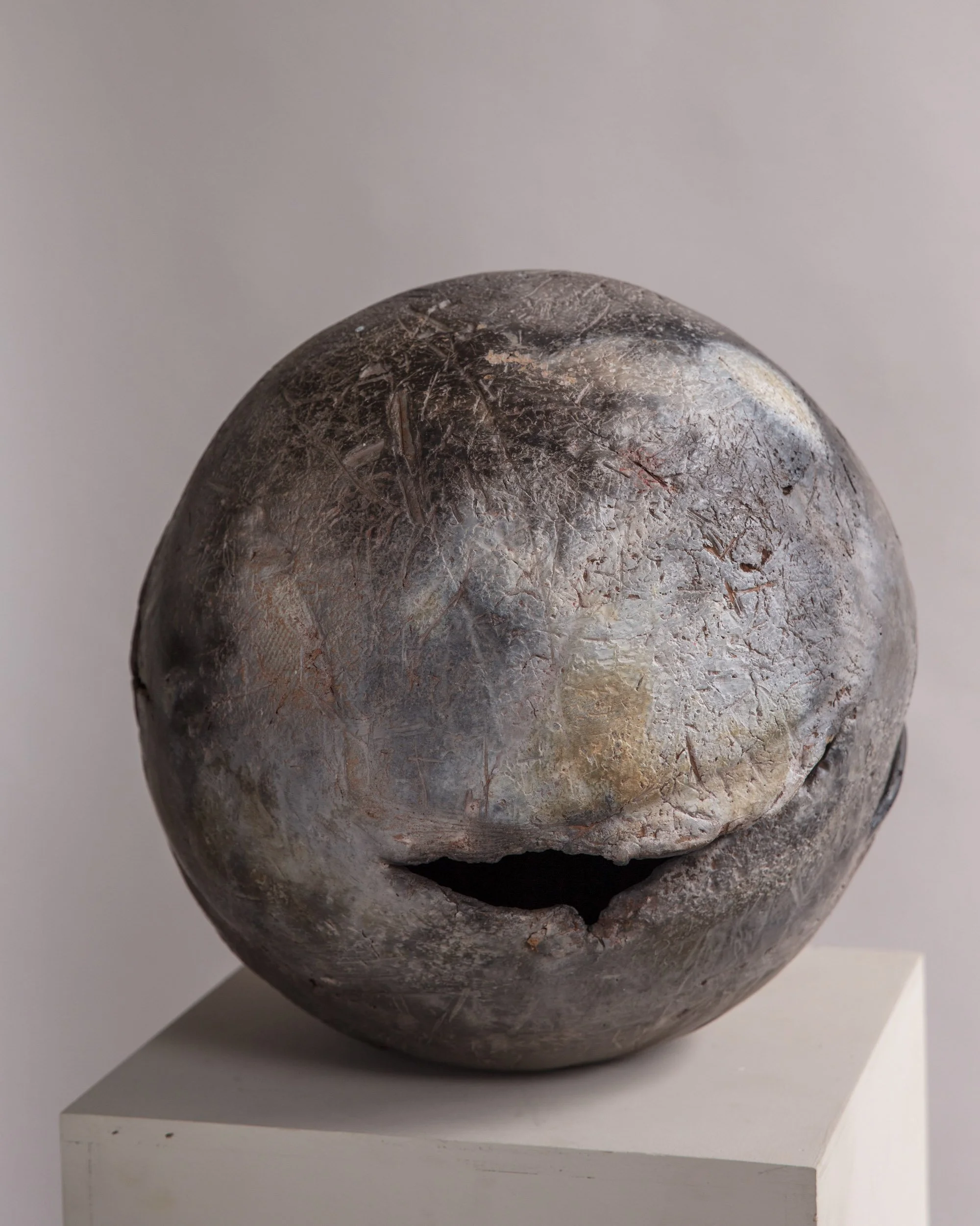 #24 Crackled Moon, 2025, H 8.5" x D 8.5", Sculpture clay, terra sigillata, metalic glaze.